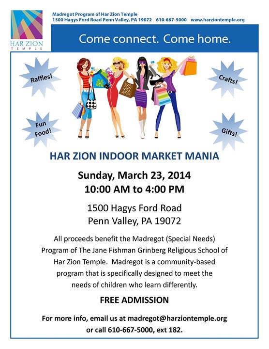 March 23rd – Har Zion’s Indoor Market Mania 18 Tuesday Mar 2014 Posted by KTE in Uncategorized ≈ Leave a comment Please join us on Sunday to Har Zion’s Indoor Market Mania to support Har Zion Temple’s Special Needs Madregot Program. We look forward to seeing you there! Share this: Click to share on X (Opens in new window) X Click to share on Facebook (Opens in new window) Facebook Like Loading... Related