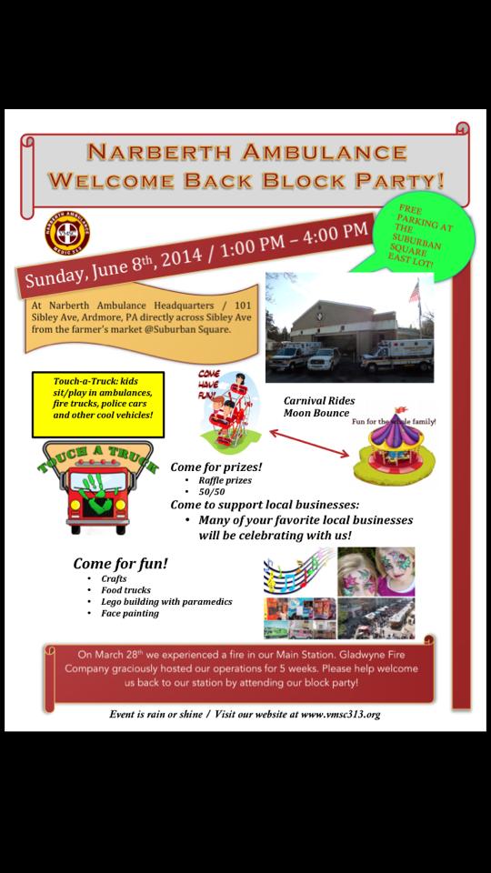 June 8th – Narberth Ambulance Welcome Back Block Party 13 Tuesday May 2014 Posted by KTE in Community Building ≈ Leave a comment Sunday, June 8th….Block party to celebrate the return to the station in Ardmore for Narberth Ambulance. Located next to the legendary shopping area of Suburban Square. Bring the family. Spread the word…. Share this: Click to share on X (Opens in new window) X Click to share on Facebook (Opens in new window) Facebook Like Loading... Related