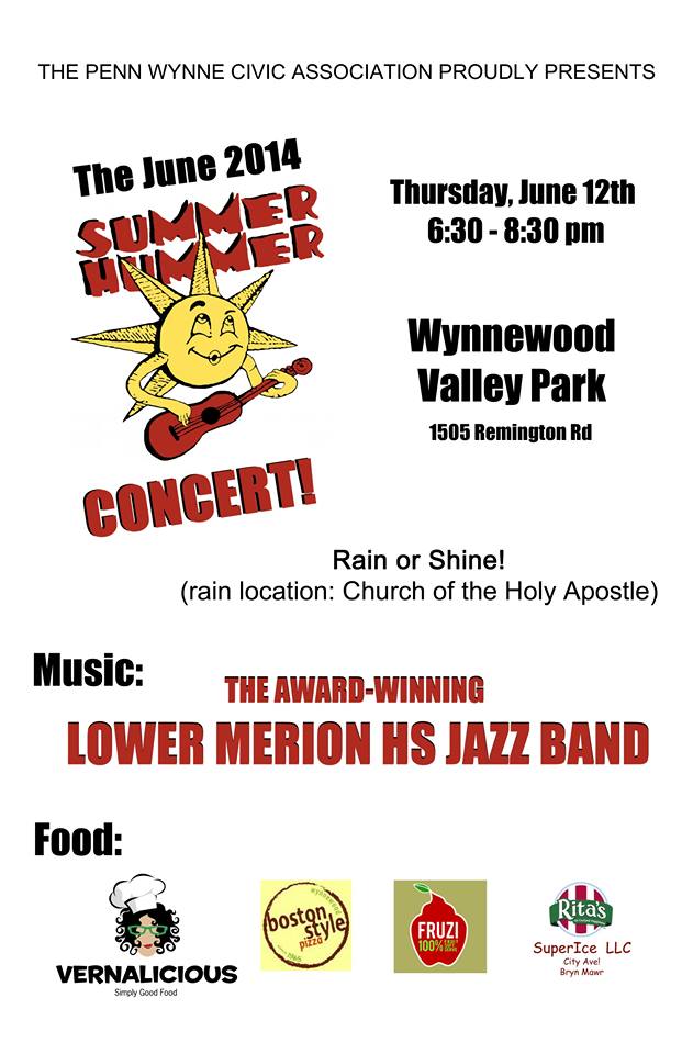The legendary Lower Merion High School Jazz Band will headline the 16th Anniversary Penn Wynne Summer Hummer Concert on Thursday, June 12th from 6:30 – 8:30pm in Wynnewood Valley Park. There will be plenty of great food, too (Vernalicious, Boston Style Pizza, Fruji), so come hungry! This event will take place rain or shine (rain location: Church of the Holy Apostles, Remington Rd, Wynnewood). Great way to kick-start the summer and give the LMHS Jazz Band a rousing send-off on their summer concert tour of Italy. Please join us!