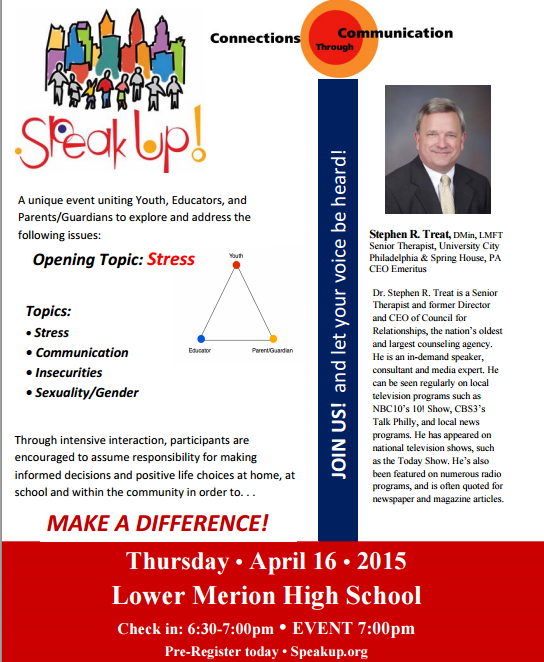 High School parents — LMHS is running a wonderful evening event for parents and high school students on April 16th. SpeakUp is a unique event uniting Youth, Educators, and Parents/Guardians to explore and address the following issues: Stress, Communication, Insecurities, and Sexuality/Gender. The guest speaker will be Dr. Stephen R. Treat. Dr. Treat is a Senior Therapist and former Director and CEO of Council for Relationships, the nation’s oldest and largest counseling agency. He is an in-demand speaker, consultant and media expert. He can be seen regularly on local television programs such as NBC10’s 10! Show, CBS3’s Talk Philly, and local news programs. He’s also been featured on numerous radio programs, and is often quoted for newspaper and magazine articles. This event is intended for all high schools (youth, educators and parents)! Register online (speakup.org) or check in and register on site at 6:30 pm on 4/16. The night ends at 8:30PM.