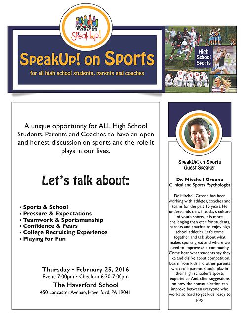 For parents with high school student athletes, I highly recommend the SpeakUp! on Sports program to be held on Thursday, February 25th. Dr. Mitchell Greene, a well known and highly respected Sports Psychologist in the area, will be the featured speaker. The program is an opportunity for HS students, parents and coaches to have an open dialogue about the the joys and pressures of being a HS student athlete. For more information and to pre-register for this FREE event check out the SpeakUp website athttp://www.speakup.org